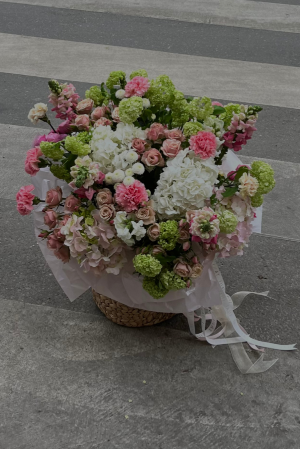 «Волшебная корзина» — это эффектная и элегантная композиция из сезонных цветов. Гортензия, кустовая роза, эустома, вибурнум и хризантема гармонично сочетаются, создавая насыщенный и естественный образ. Такая корзина подойдёт для особых случаев, в качестве подарка или украшения интерьера. Композиция собирается из свежих сезонных цветов и долго сохраняет привлекательный вид при правильном уходе.