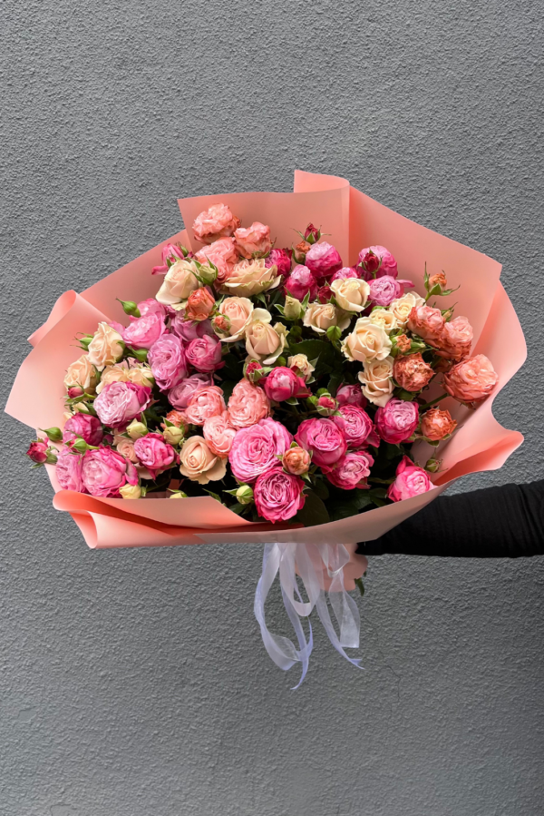 Микс из 15 веточек спрей-роз включает Bubble, Madame Bombastic, Lady Bombastic и Bombastic. Каждая веточка отличается изящной формой и насыщенным цветом, создавая элегантную и романтичную композицию. Такой букет подходит для подарка, маленького знака внимания или украшения интерьера. Композиция собирается из свежих цветов и долго сохраняет привлекательный вид при правильном уходе.