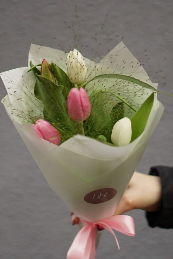 Букет из 5 тюльпанов с паникумом — это лёгкая и утончённая композиция с весенним настроением. Яркие тюльпаны гармонично сочетаются с воздушной текстурой паникума, создавая аккуратный и стильный образ.