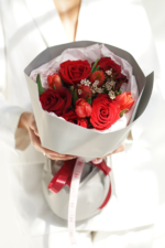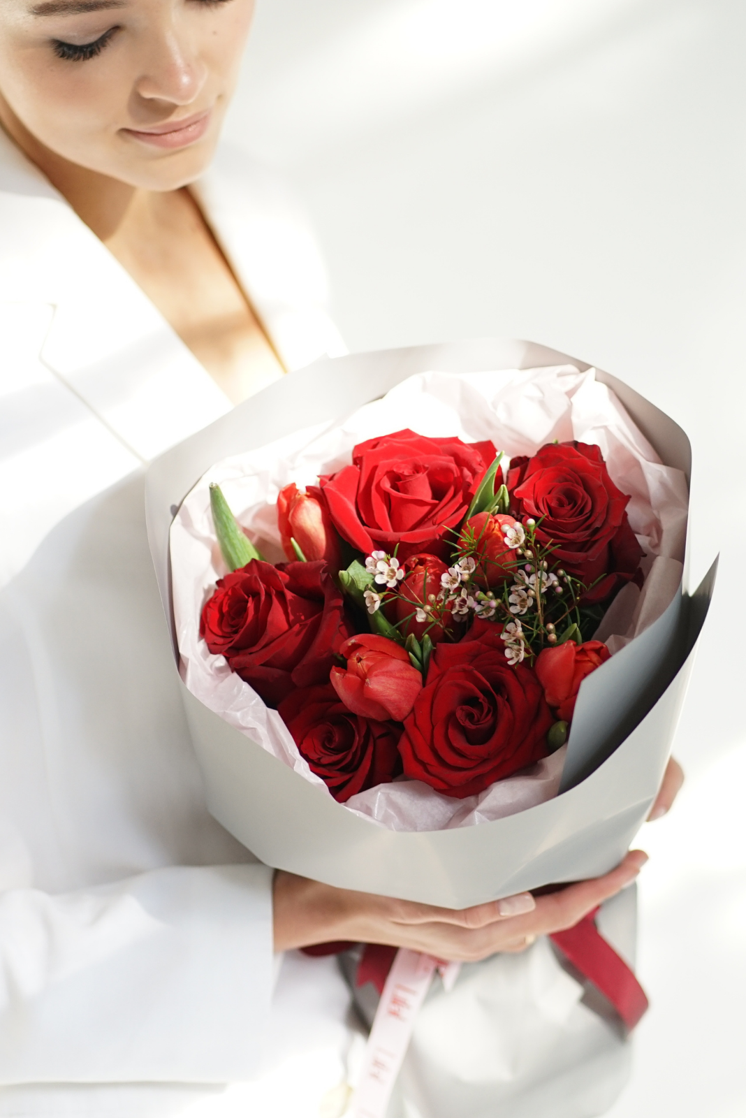 Композиция из красной розы и красного тюльпана с добавлением вакса создаёт выразительный и элегантный букет. Красный цвет символизирует любовь, страсть и уважение, а вакс придаёт композиции лёгкость и текстурную глубину. Отличный выбор для романтического подарка, юбилея или особого повода.