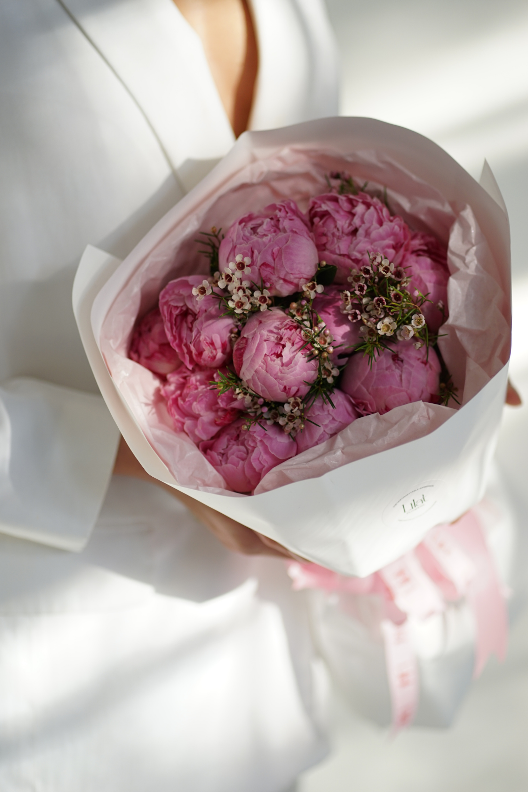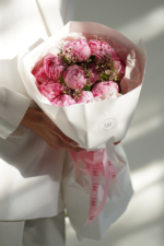 Букет из 11 пионов сорта «Сара Бернар» с добавлением вакса смотрится объёмно и изысканно. Пышные бутоны пионов гармонично сочетаются с лёгкими акцентами, создавая элегантную композицию для особых моментов.